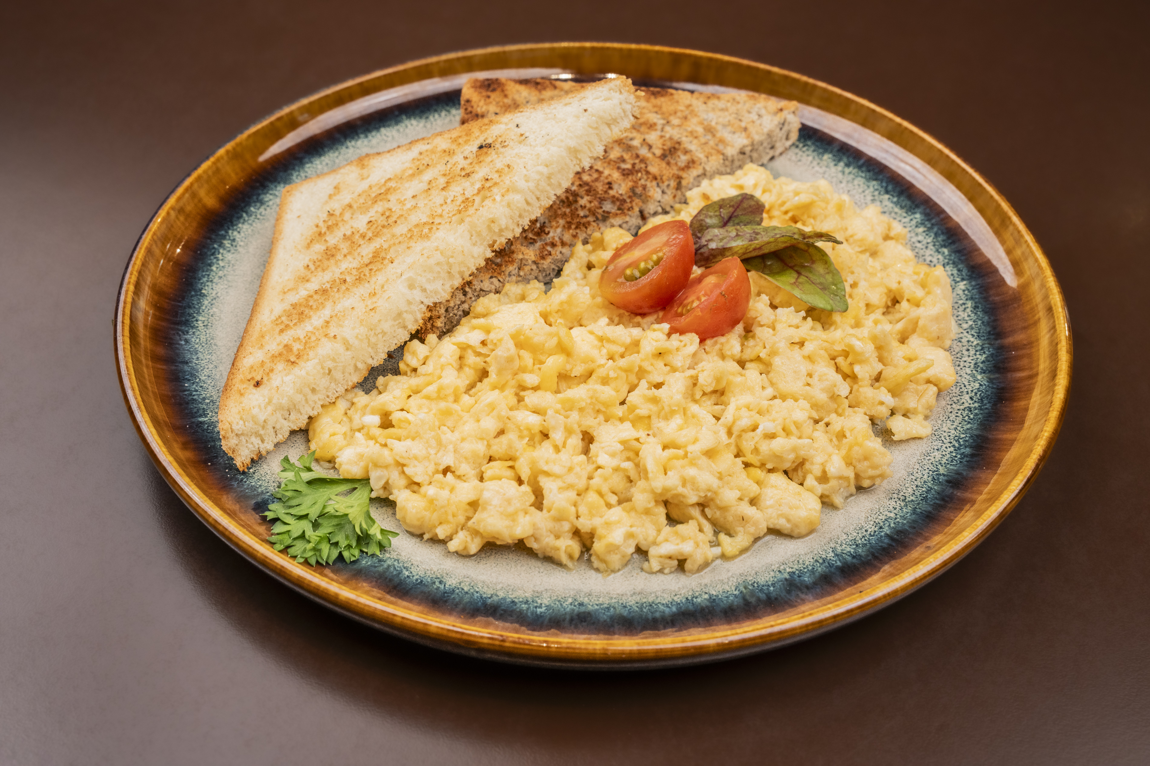 Enjoy your choice of creamy scrambled, fried, or golden sunny-side-up eggs, made to your liking with a side of toasted bread.