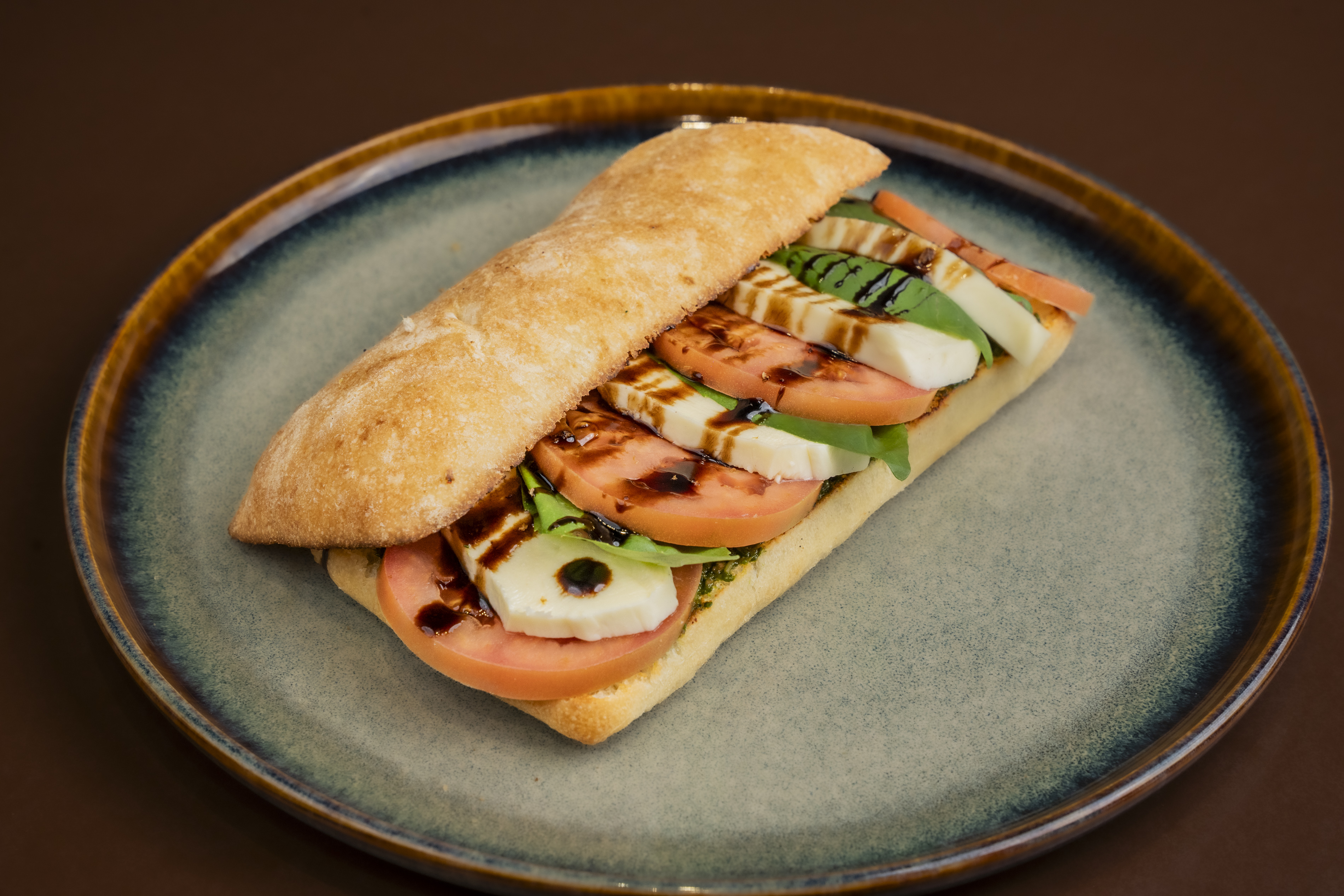 Fresh mozzarella, cherry tomatoes, basil, and pesto on warm sourdough or rosemary focaccia.
