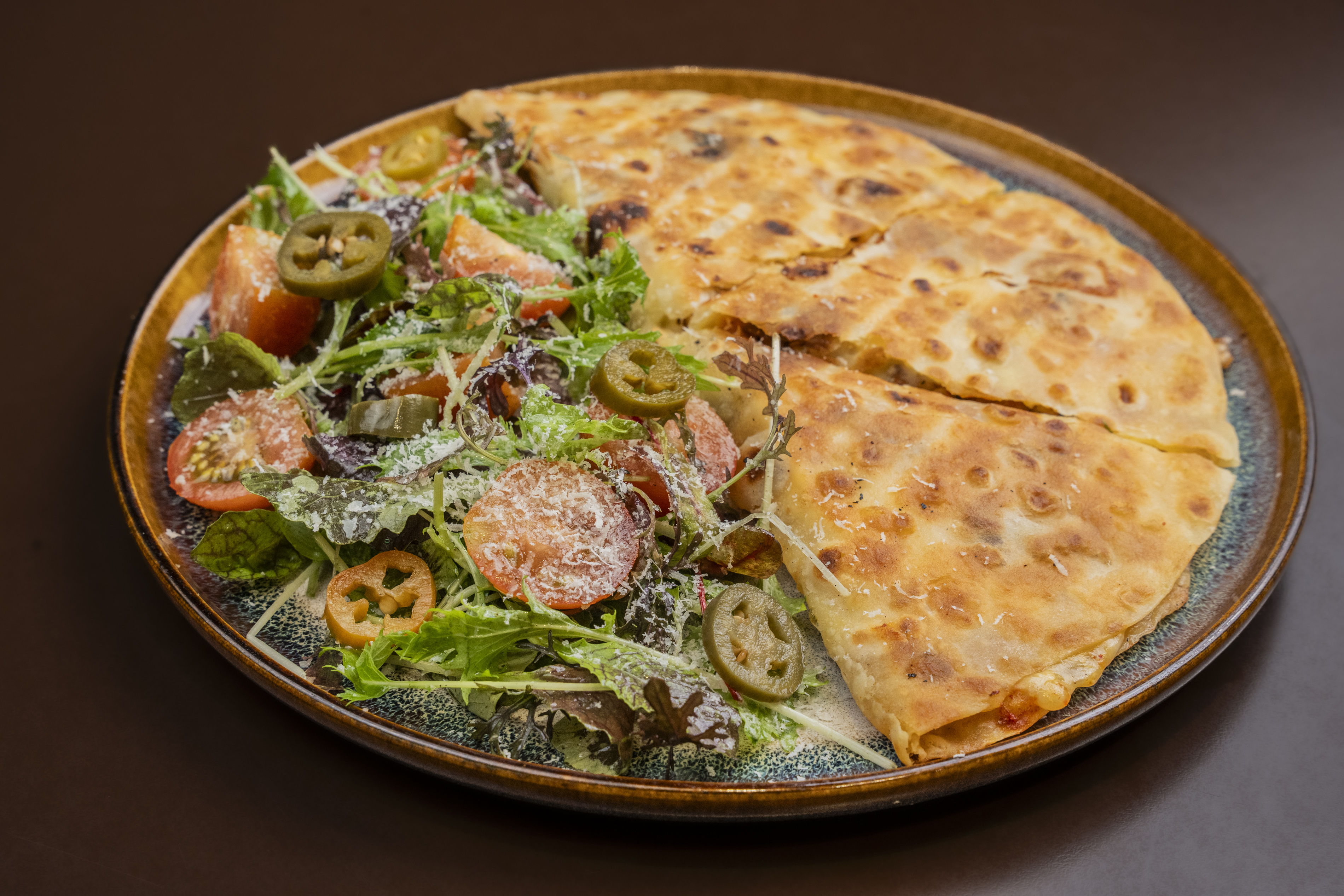 Golden flour tortilla filled with melted mixed cheeses and tangy sauce, served with jalapenos and sour cream served with your choice of grilled chicken, beef or tuna