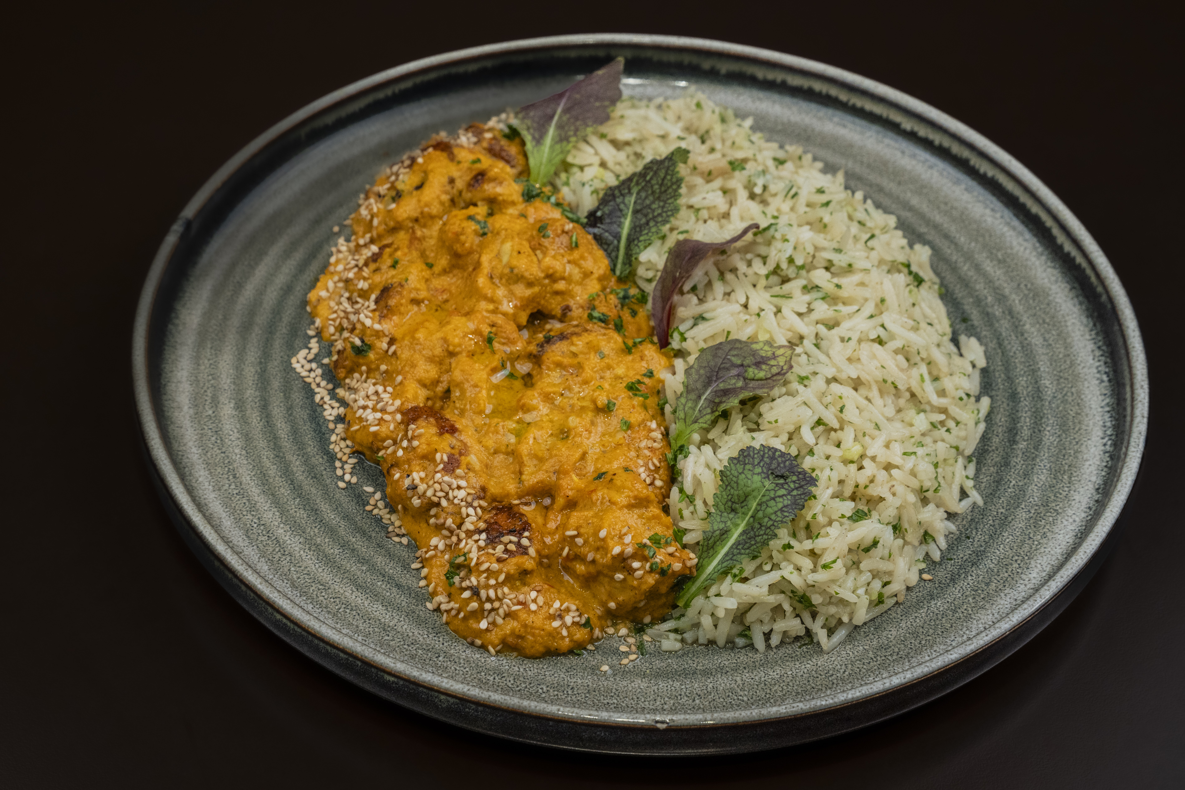 Tender chicken in curry sauce over white rice, topped with caramelized onions, sesame seeds, and parsley.