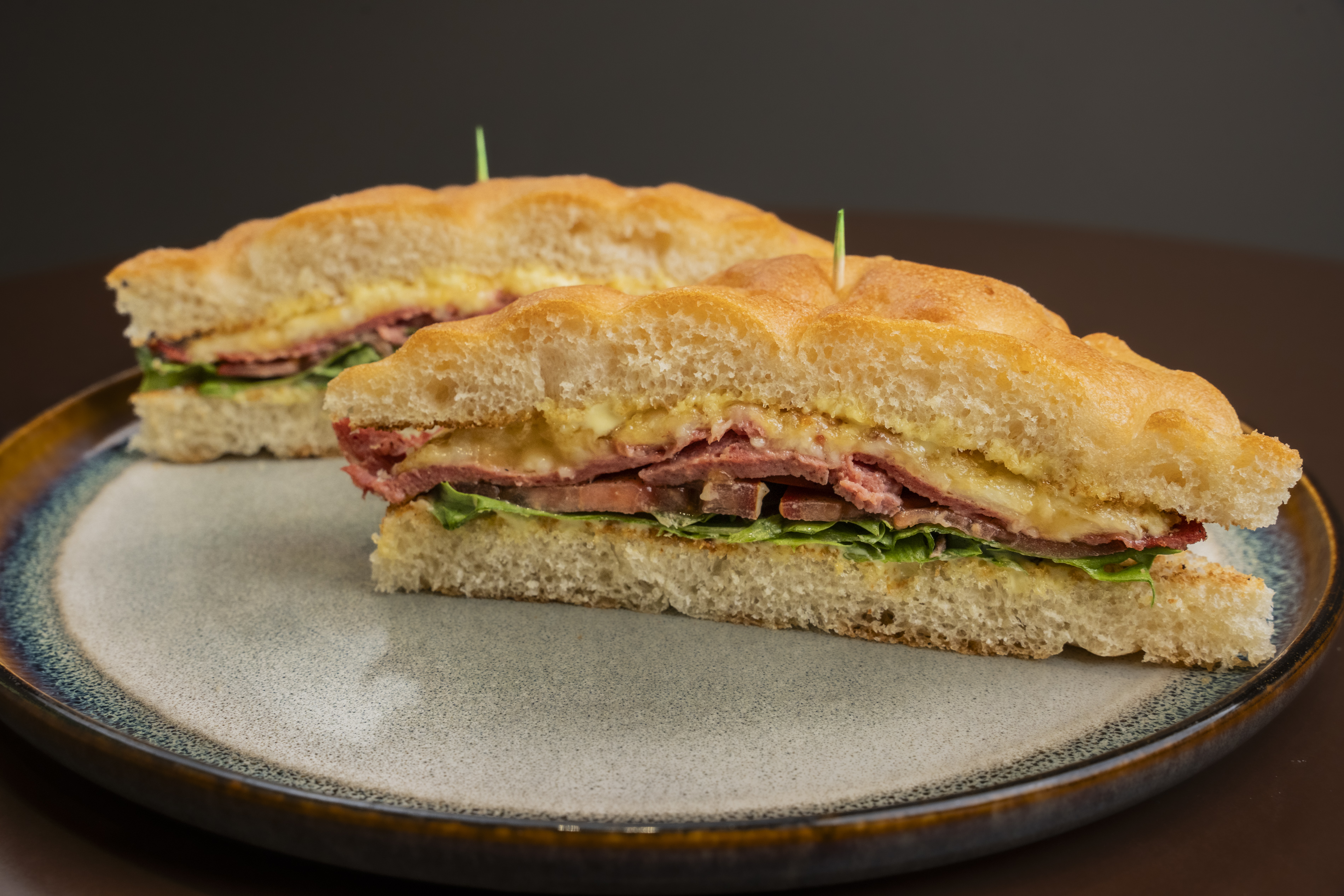 rosemary focaccia layered with sliced beef mortadella, melted mozzarella, and fresh basil