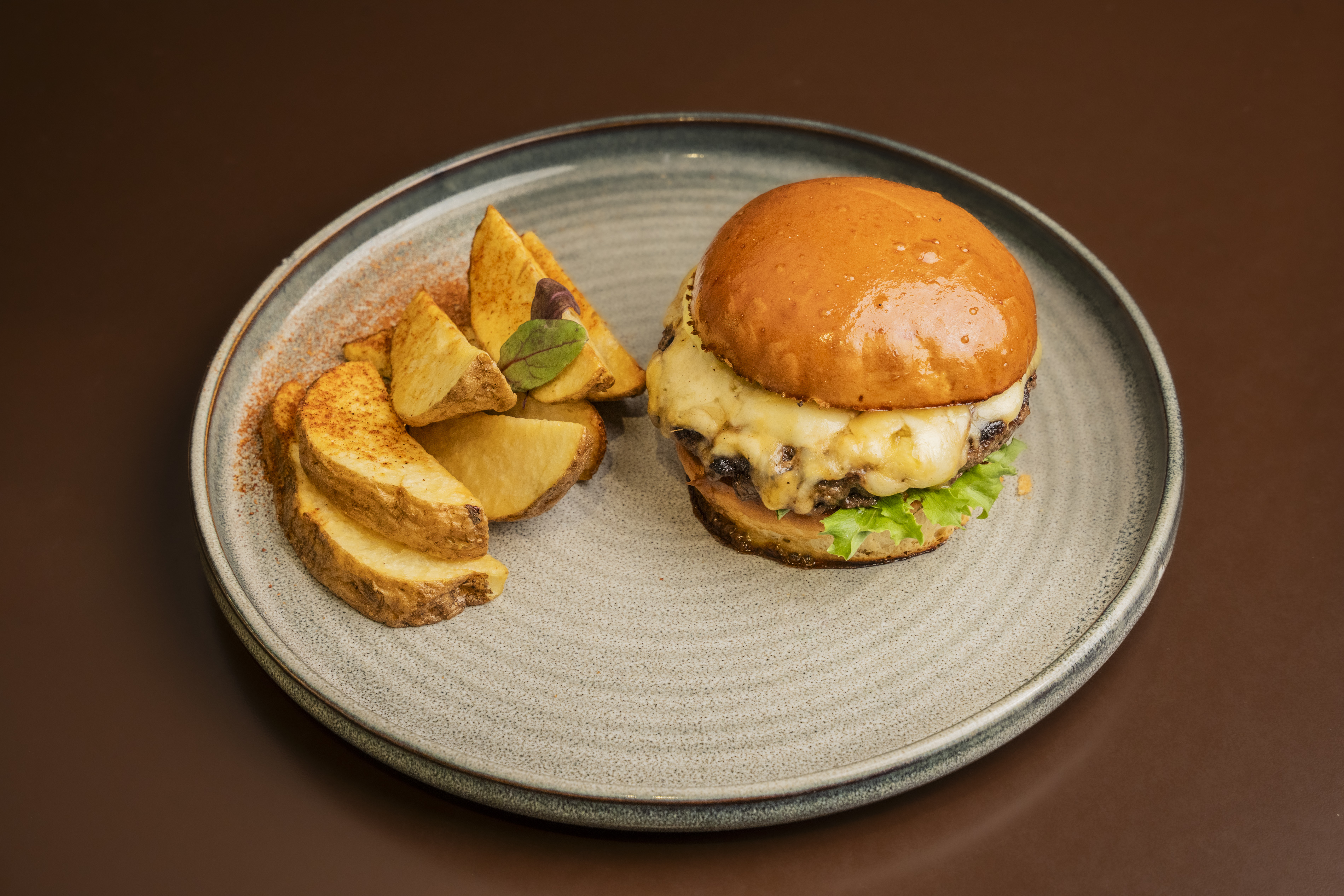 Gouda cheese melted on our fresh steak burger served with leaf lettuce, tomato- with a side of roasted beef