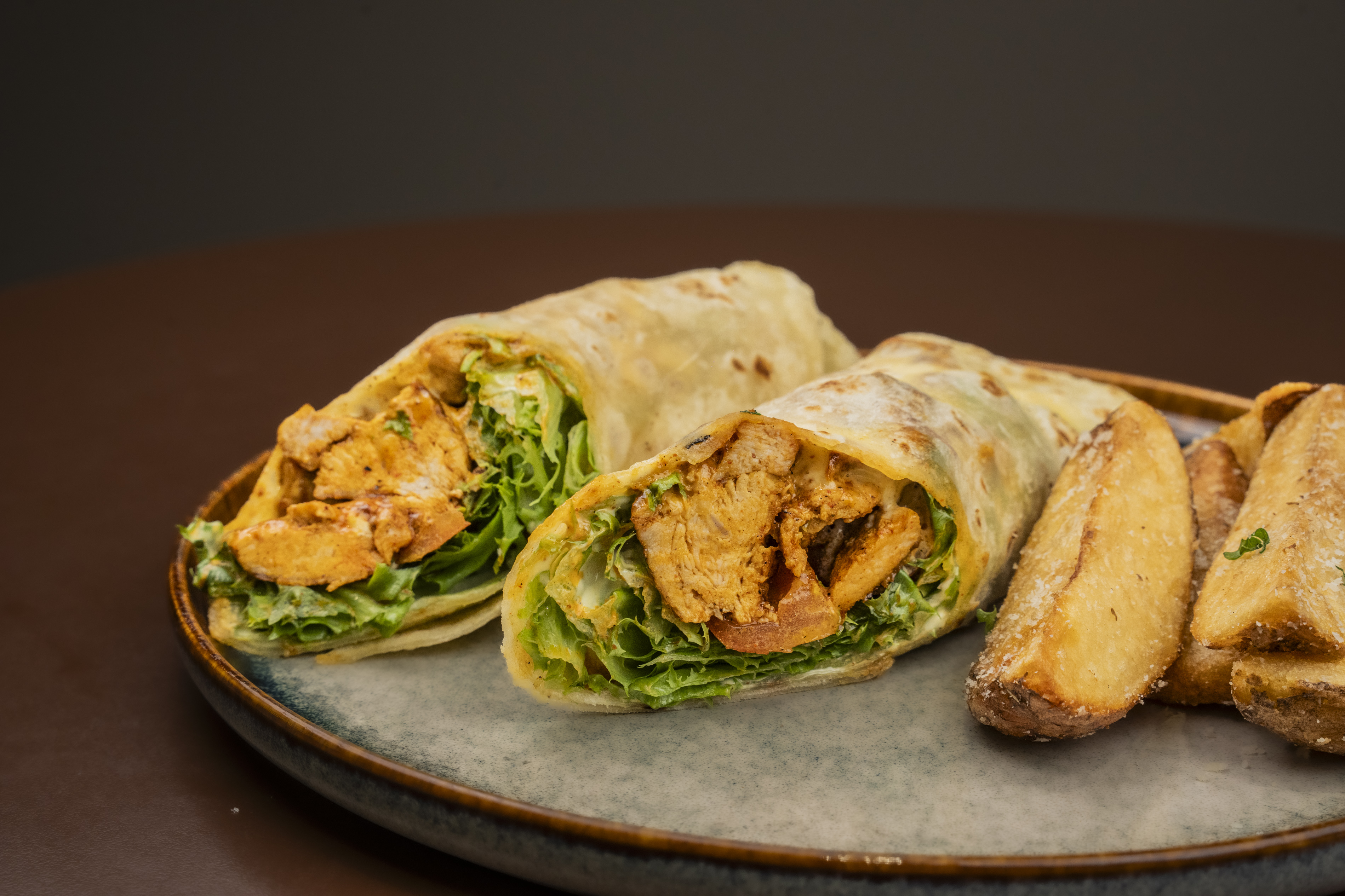 Soft tortilla filled with grilled chicken, crisp romaine lettuce, cherry tomatoes, and our homemade garlic mayo for a flavorful bite.