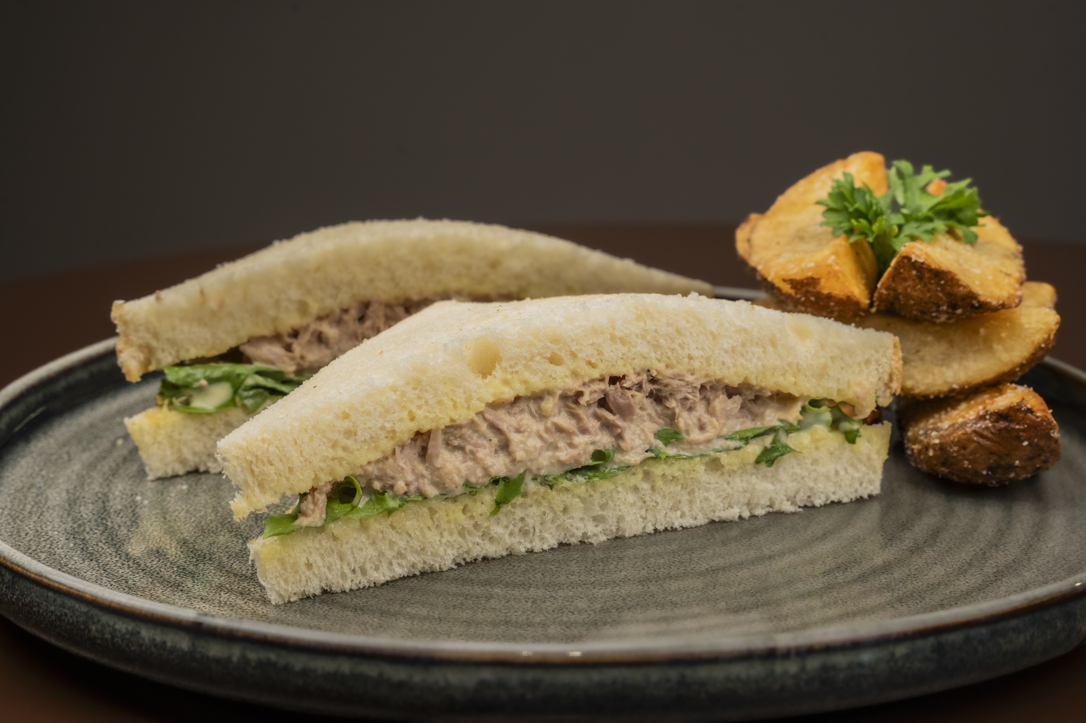 Enjoy a creamy tuna, fresh lettuce, and a creamy dressing, served in soft, crustless bread served with side salad .